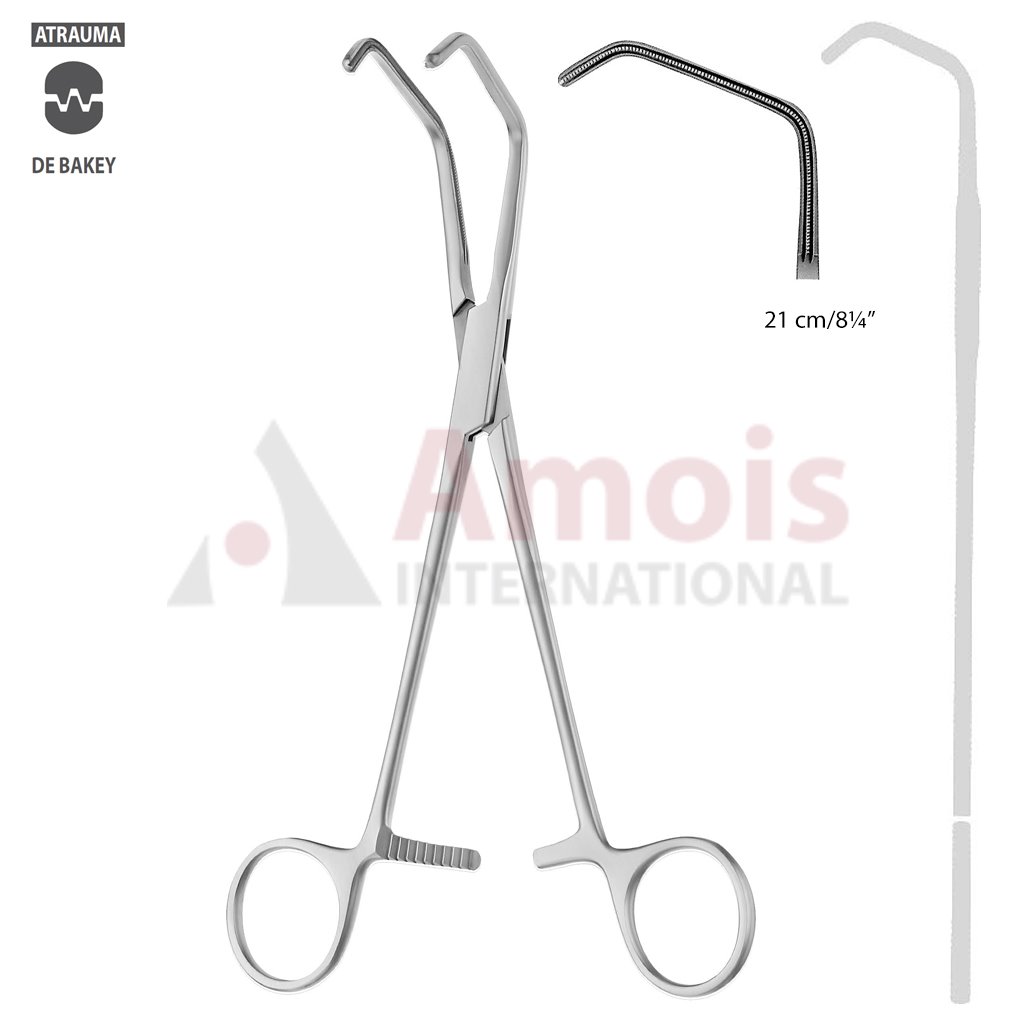 DeBakey-BECK ATRAUMATIC Vena Cava Clamp, Angled, 60 Degree, 210 mm (8 1/4″), Satinsky-Shaped, Toothing DeBakey, Jaw Length: 80 mm, Width: 45 mm