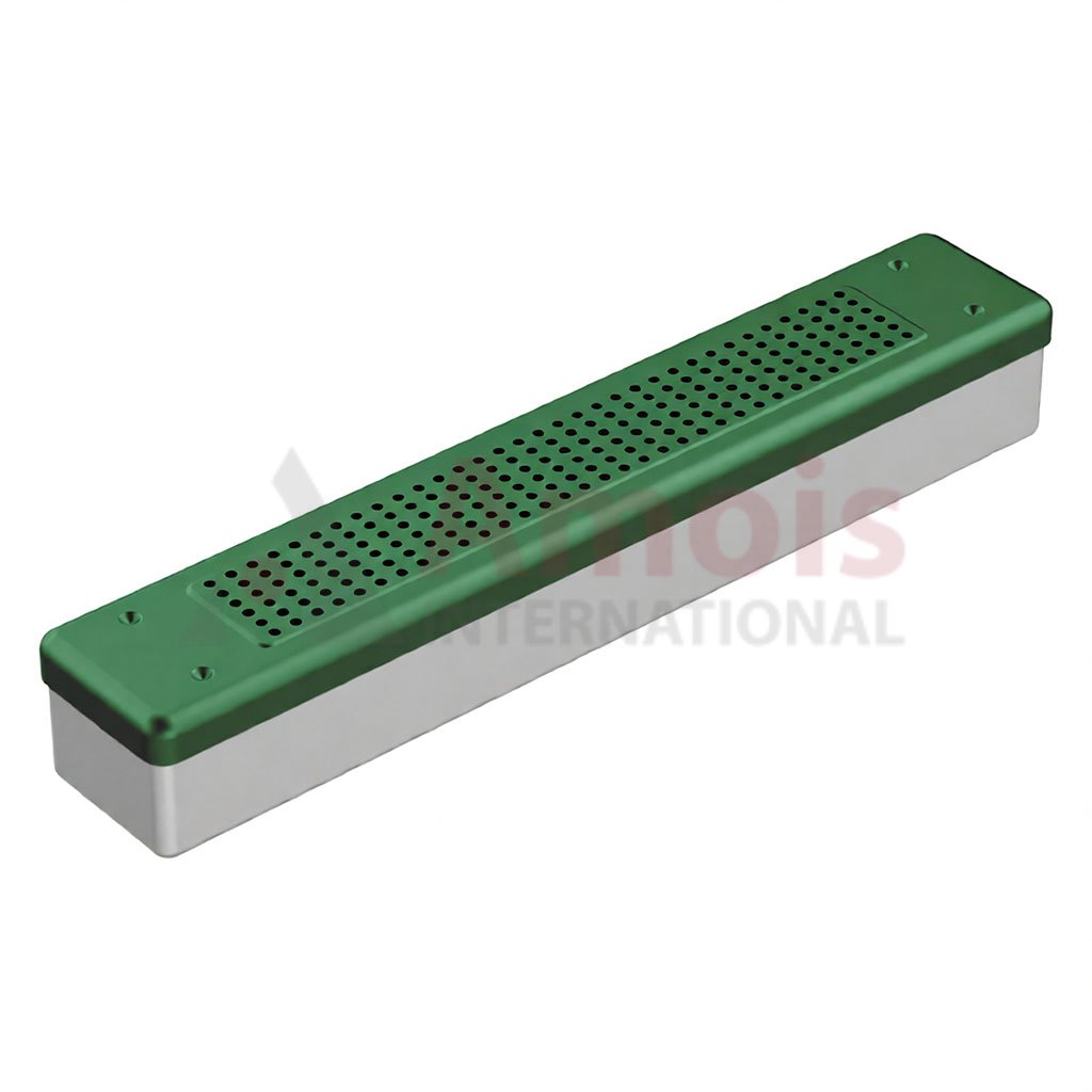 Be the first to review “Scope-Sterilisationscontainer outside 455x80x70mm, green Lid perforated – Bottom perforated”